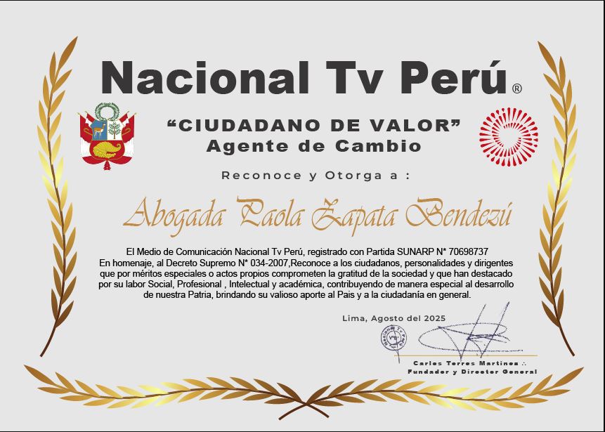 Nacional Tv Perú otorgó el reconocimiento de “Ciudadana de Valor” a la Abogada Paola Zapata Bendezú