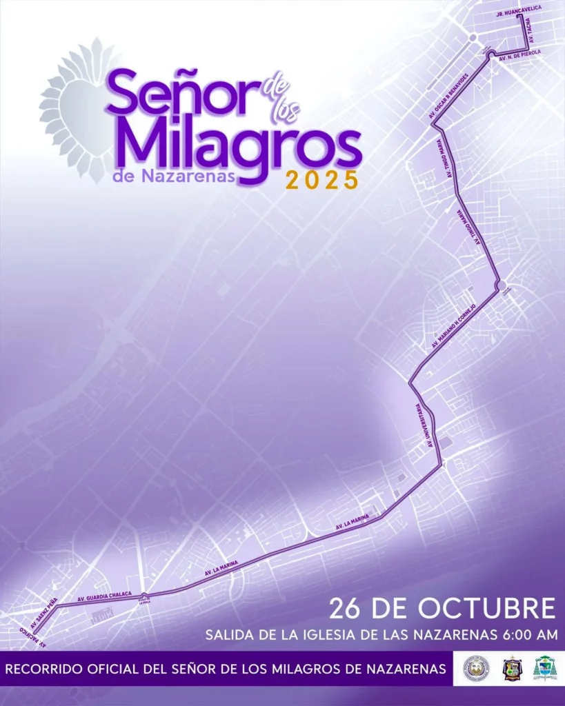 El recorrido incluirá las avenidas Tacna, Nicolás de Piérola, Óscar R. Benavides (ex Colonial), Tingo María, Mariano Cornejo, Universitaria, La Marina y Guardia Chalaca, hasta llegar a Sáenz Peña y República de Panamá, donde se celebrará una misa central en honor al Señor de los Milagros.
