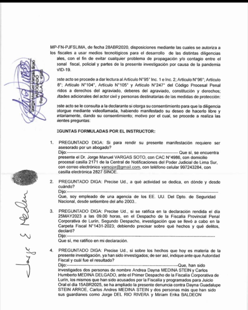 Se señala que la denuncia interpuesta por Medina habría sido premeditada y direccionada mediante presunto tráfico de influencias en altos niveles de la Policía Nacional del Perú. Existen correos electrónicos amenazantes enviados desde Estados Unidos, así como vínculos familiares en fiscalías de Lima Sur, lo que habría derivado en un proceso judicial considerado sesgado contra el hermano peruano y su hija.