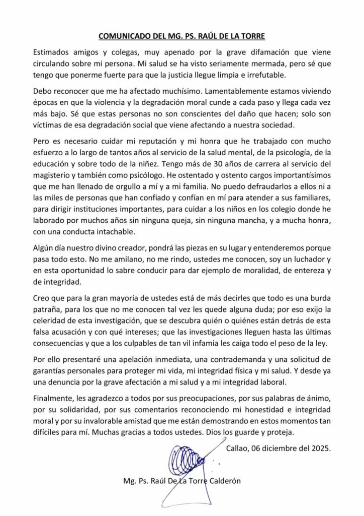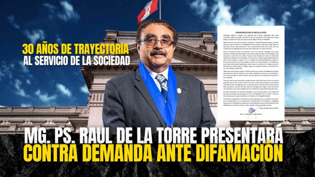 El Mg. Ps. Raúl De La Torre Calderón, reconocido profesional con más de 30 años de trayectoria en el ámbito de la psicología, la educación y la salud mental, emitió un comunicado público expresando su “profunda preocupación y pesar” ante una grave difamación que —según afirma— viene afectando su honor, su reputación y su salud.